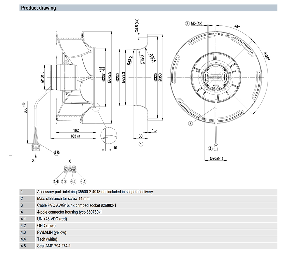 ebmpapst, Centrifugal Fan, 355mm, 48V, 290W, 4045m3/h, 450Pa, 1760rpm