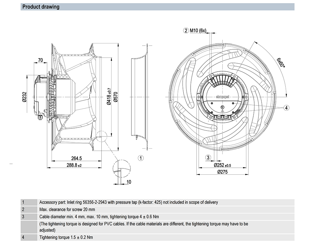 ebmpapst, Centrifugal Fan, 560mm, 400V, 3950W, N/Am³/h, N/APa, 1900rpm, N/AdB