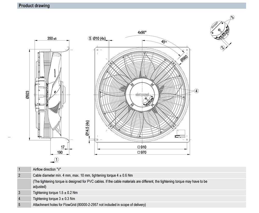 ebmpapst, Axial Fan, 800mm, 400V, 3500W, 31740m³/h, 350Pa, 1190rpm, 86dB